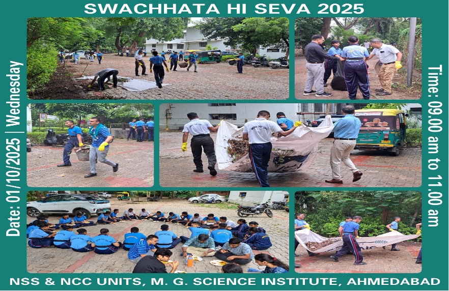 As part of the nationwide initiative “Swachhata Hi Seva 2025”, M. G. Science Institute, Ahmedabad, organized a Campus Cleaning Campaign on 1st October, 2025. The program was jointly conducted by the NSS and NCC Units of the institute to spread awareness about cleanliness and to inculcate the values of hygiene, responsibility, and community service among students.